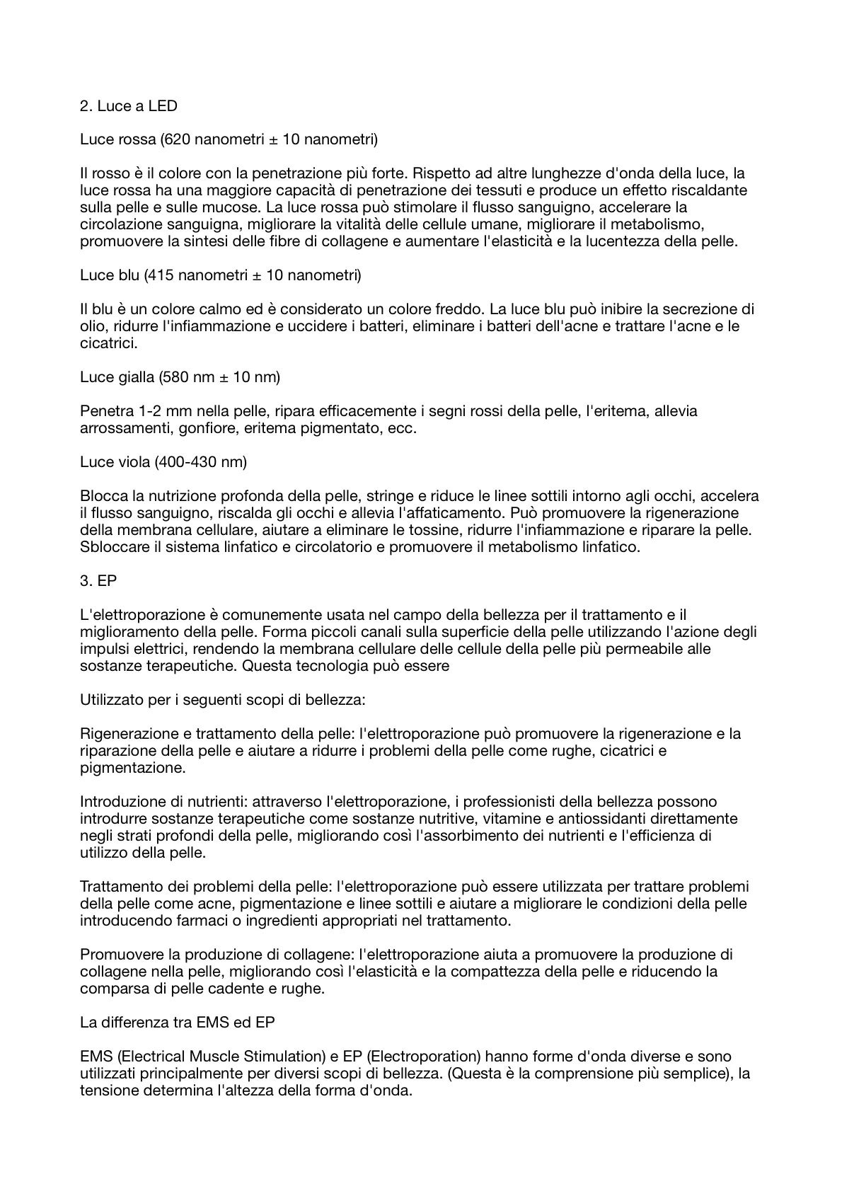 - Sfrutta la funzione di LED-Terapia (o fototerapia) con 4 intensità (Rossa-Blu-Gialla-Viola) per rigenerare le cellule del tuo viso e collo.